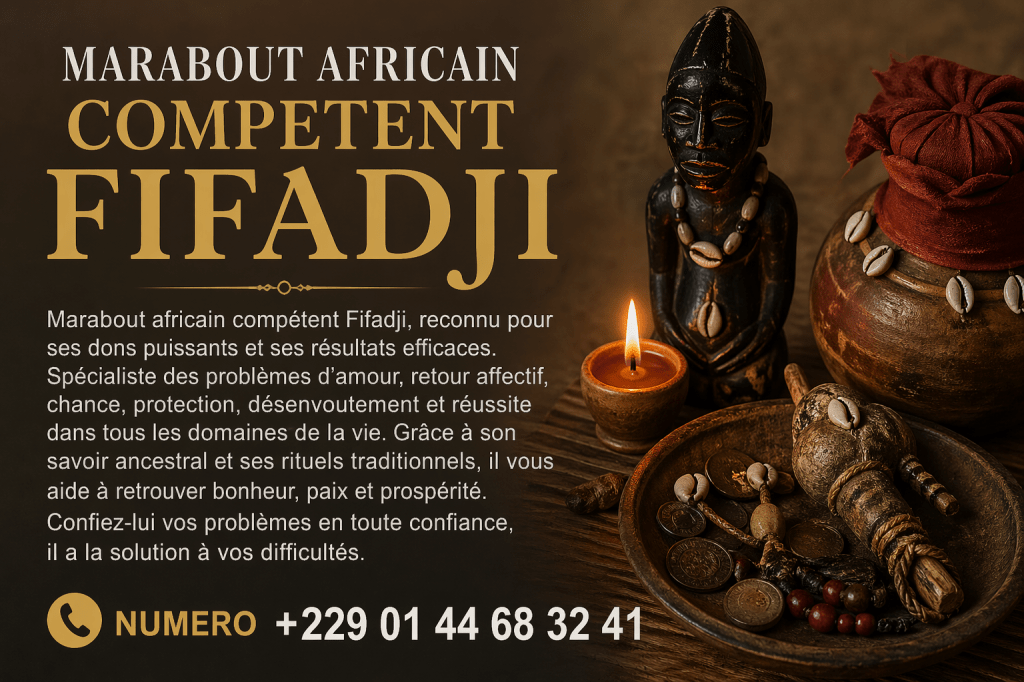 Découvrez les puissantes compétences spirituelles du Grand Maître Marabout du Bénin Papa Fifadji, reconnu comme l’un des plus influents guides spirituels spécialisés dans le retour affectif, la résolution des problèmes sentimentaux, financiers et familiaux. Grâce à son savoir ancestral transmis de génération en génération, il accompagne des milliers de personnes en quête de solutions rapides, efficaces et discrètes.